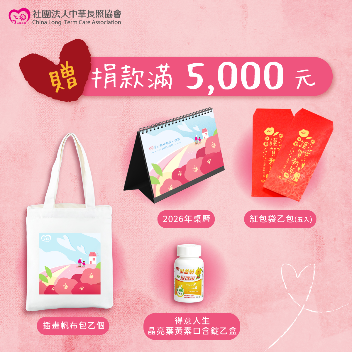 捐款滿5,000元 ►贈2026年桌曆+紅包袋一包(5入/包)+插畫帆布包乙個+得意人生晶亮葉黃素口含錠乙盒(60錠/罐)
