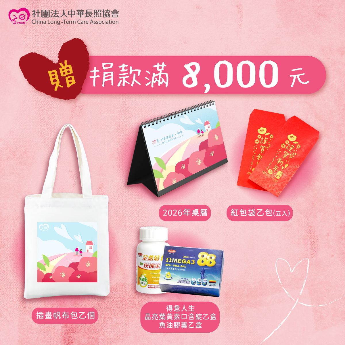 捐款滿8,000元 ►贈2026年桌曆+紅包袋一包(5入/包)+插畫帆布包乙個+得意人生晶亮葉黃素口含錠乙盒(60錠/罐)+得意人生超高濃度魚油膠囊乙盒(30粒/盒)