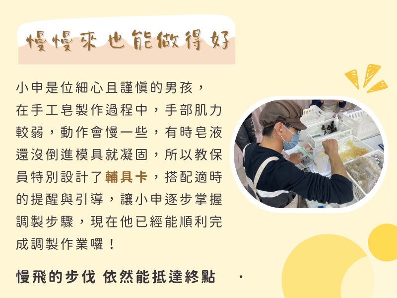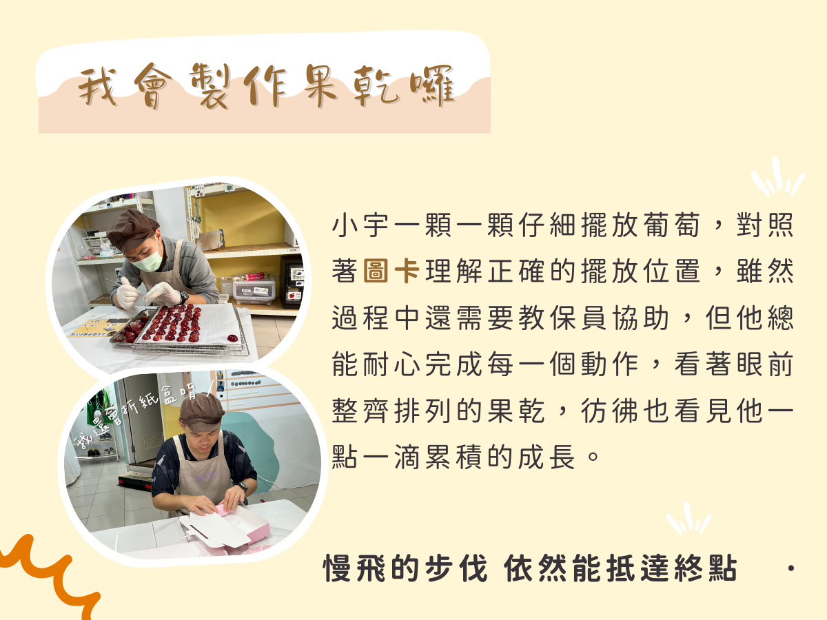 在這裡,慢飛天使們透過實際的產品製作與任務分工,練習工作流程、時間管理與團隊合作。